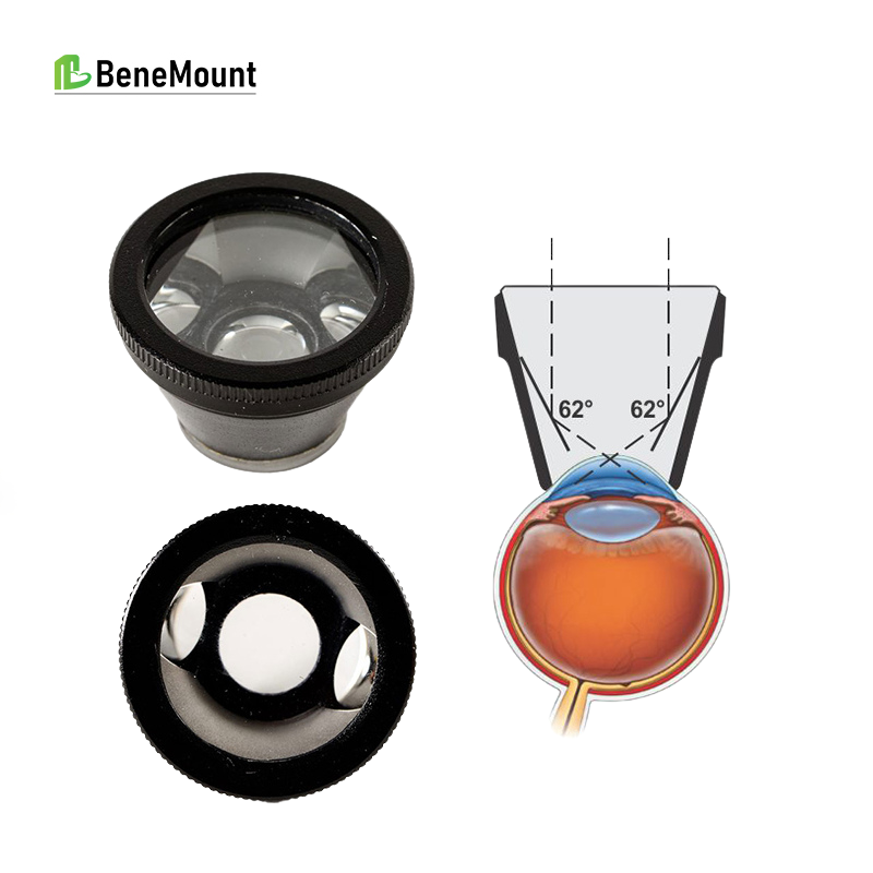 Two opposing mirrors are tilted at 62°, providing a complete 360° view of the anterior chamber angle by simply rotating the lens 90°.